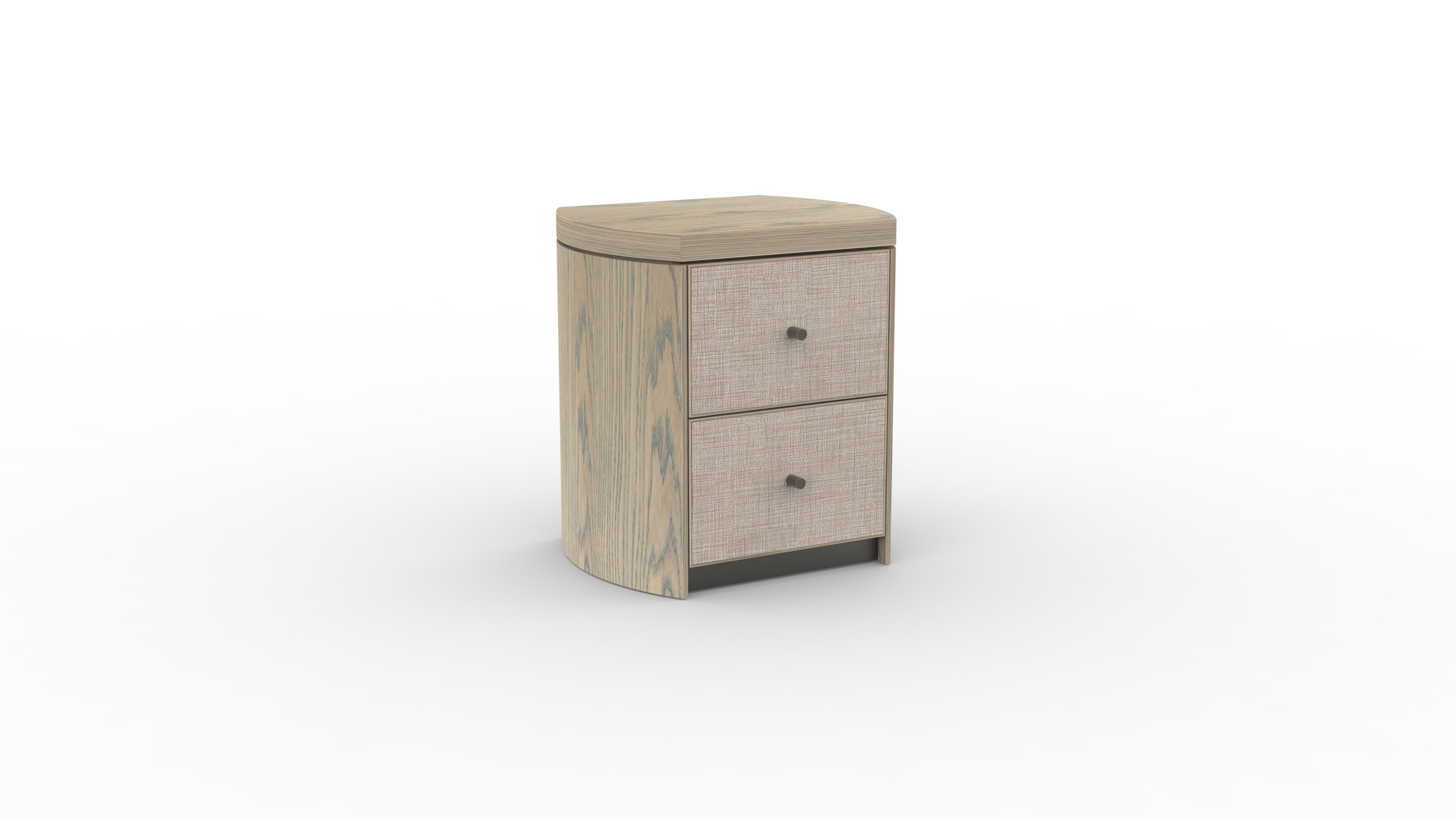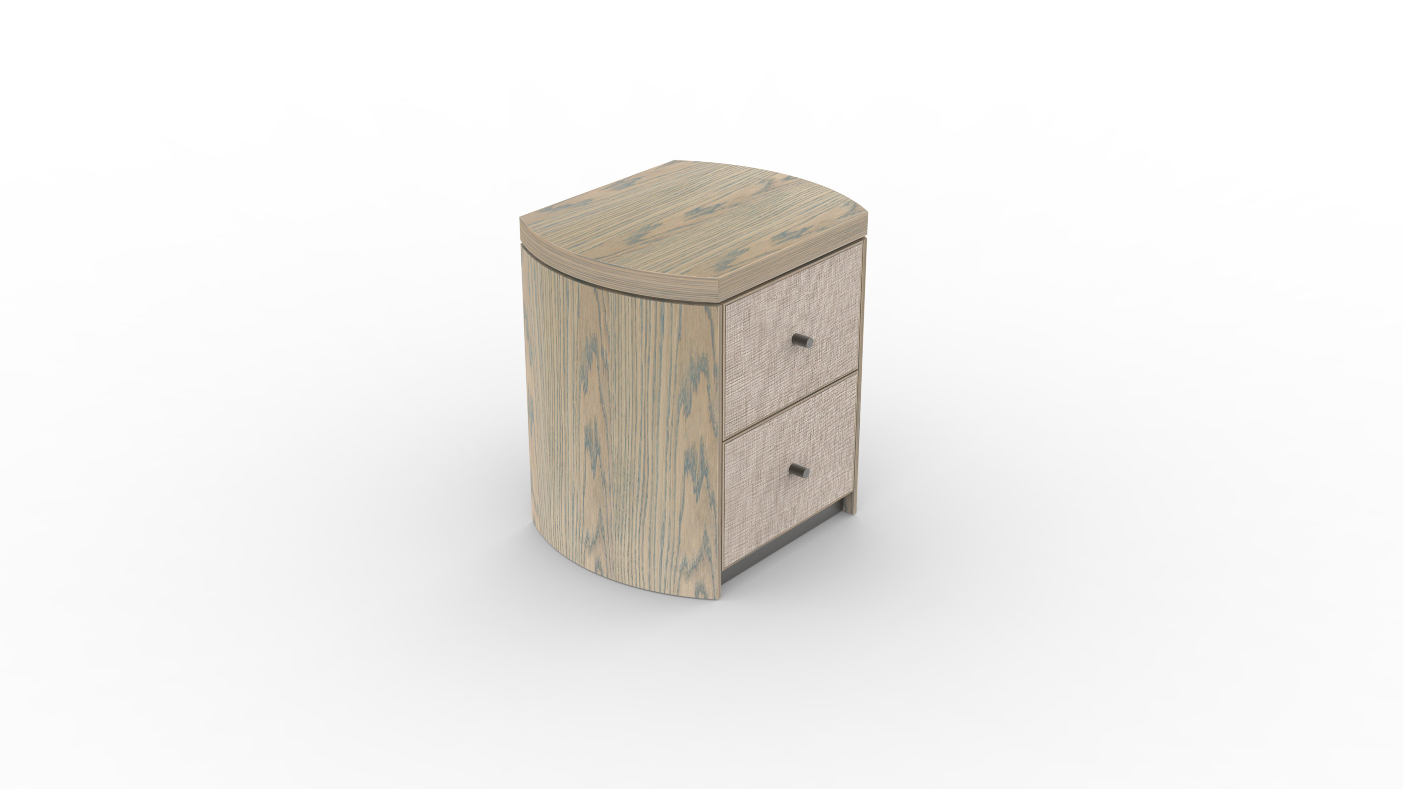 The Albert Bedside Cabinet pairs curved sides with a substantial top for a bold, elegant presence. Two soft-closing drawers offer practical storage, while a brass base plate and customisable drawer fronts elevate the design with individuality and refinement.